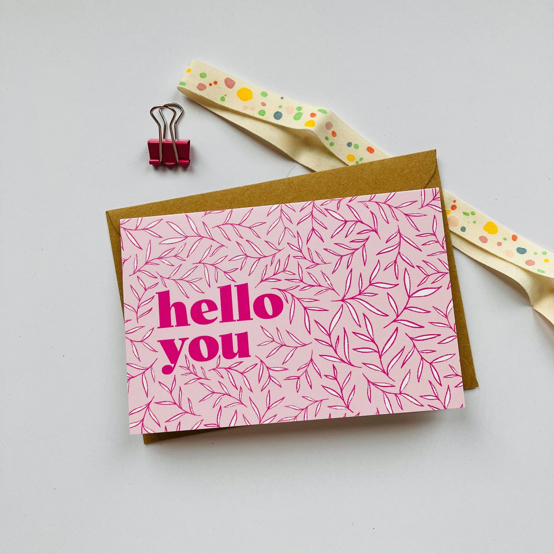 This is a just-like-that greeting card to send to someone you are thinking about. It features a beautiful hand-drawn pattern design with gorgeously vibrant and modern pink typography.